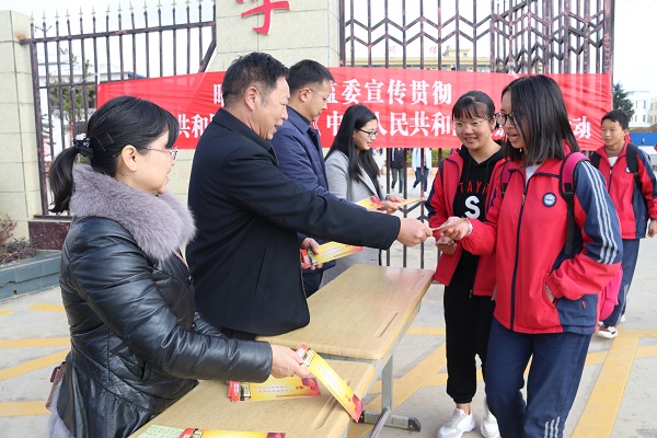 昭通市昭陽區紀委監委黨總支部結合“主題黨日”活動,到永豐鎮中學開展宣傳貫徹監察法活動,加強青少年法制教育,讓監察法知識從小扎根。(羅瑜 攝)