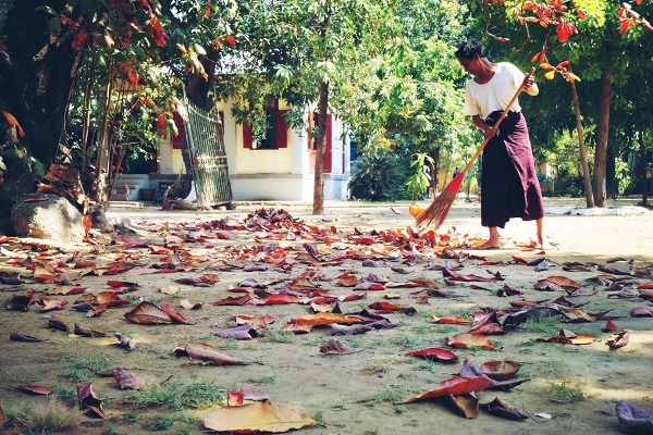 立秋時節(jié),寨子中央平日里枝繁葉茂的大榕樹開始落葉。(周榮 攝)