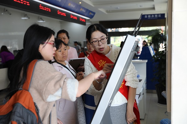 導(dǎo)稅員正在引導(dǎo)納稅人下載、使用手機(jī)APP,通過(guò)網(wǎng)絡(luò)實(shí)現(xiàn)自助繳稅,方便群眾辦事。(胡一山 攝)