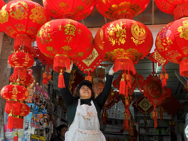 顧客駐足挑選燈籠和福字,臉上洋溢著幸福的笑容,紅燈照福氣來,是每個人對紅紅火火生活的祈愿。(康關(guān)福 攝)
