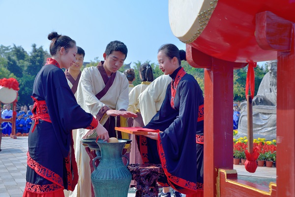 在滇南建水文廟參加臘八盥洗禮的學子們身著漢服,虔誠地用清泉水凈手凈心,感悟清爽、修身養德。(宗慶 攝)