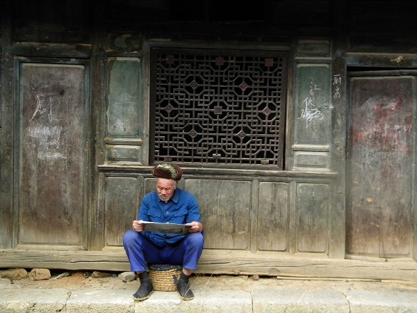 雖身已老,而心如初,雖居廟堂之遠仍不敢忘黨恩。退休老黨員端正坐于石林縣雙龍公園文化長廊,專注重讀黨史,再憶崢嶸歲月。(田哿 攝)