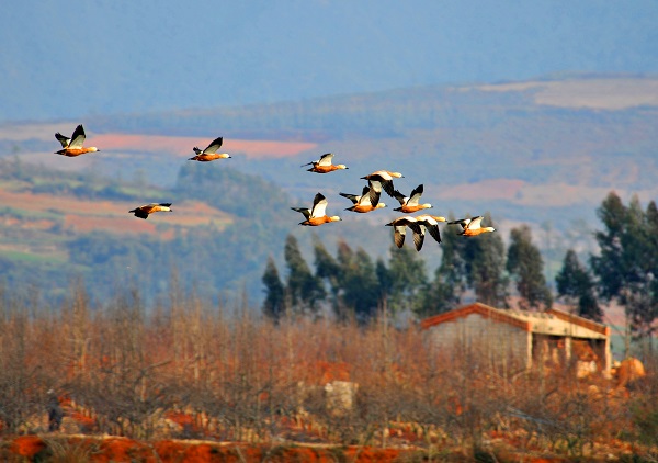 候鳥南遷,成群結隊的候鳥一路翱翔,來到了生態宜居的瀘西境內停留棲息,享受那冬日里的溫暖。(馬啟堂 攝)