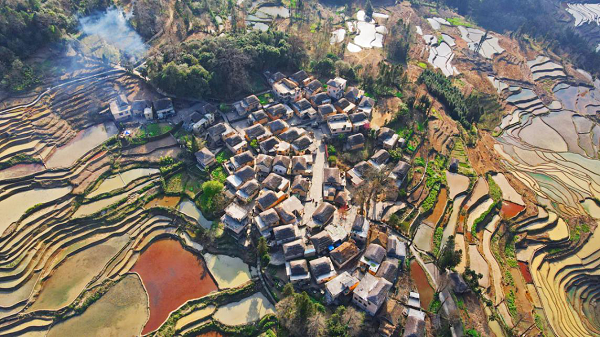 “仲春初四日,春色正中分。”春分已至,梯田春光正好,“森林—梯田—村寨—水系”四素同構,繪就了一幅和諧的哈尼梯田春光圖。(李少福 攝)