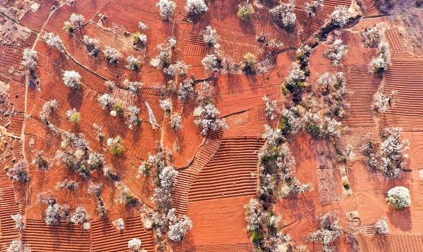 清明時節,劍川縣桑嶺村古梨園梨花競相綻放,高空俯瞰,如雪的梨花和鮮艷的紅土地交相輝映,農民們耕作的身影在其中星星點點,構成了一幅絢麗的清明春景圖。(段滌暇 攝)
