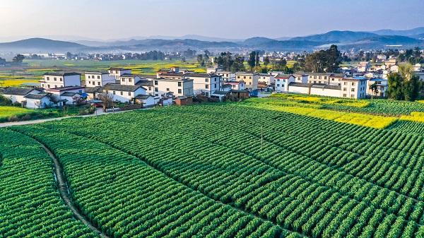 牟定縣共和鎮的田野里,長勢喜人的蠶豆、油菜和新農村交相呼應,構成春日里生機盎然的田園生態風景畫。(李光洪 攝)