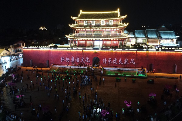 建水縣結合本地資源特色,在朝陽樓舉辦以清廉家風為主題的燈光秀,燈光點亮古城夜空,營造出崇廉尚潔的良好氛圍,吸引了大批過往市民和游客“打卡”。(劉彧行 攝)