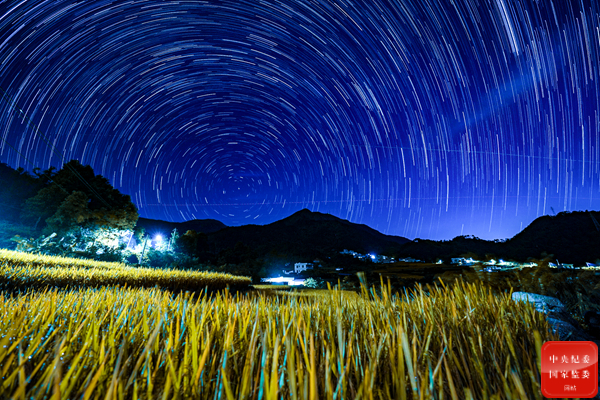 金秋十月,在廣西壯族自治區桂平市西山鎮佛荔村,豪華的星空盛宴拉開帷幕,星軌在攝影師的鏡頭下如萬花筒一般絢爛,金黃色的稻浪在星光的映照下折射出迷人的光彩。(廣西壯族自治區桂平市紀委監委供 何鴻泳 攝)