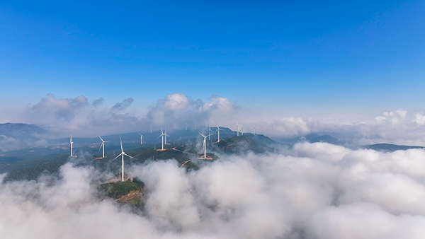 在曲靖市的諸葛南山,流沙薄霧漫過山巒,風力發電場在霧中若隱若現,宛若仙境。(楊富貴 攝)