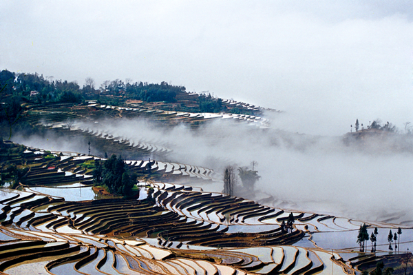 紅河哈尼梯田層層疊疊,阡陌縱橫交錯,山間云霧繚繞,波光粼粼的梯田如詩如畫,恍若仙境。(馬理文 攝)