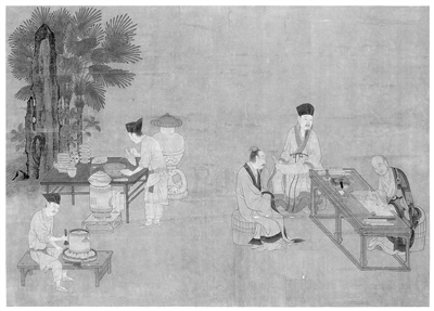 文人雅集總是少不了茶,這是南宋畫家劉松年的《攆茶圖》,右邊的三位文人,一人伏案寫字,另外兩人旁觀;左邊的兩位茶博士,一人坐在矮幾上磨茶,另一人立在桌邊,正提著湯瓶點(diǎn)茶,畫面中的茶具非常多,展現(xiàn)的是宋代的點(diǎn)茶技藝。資料圖片