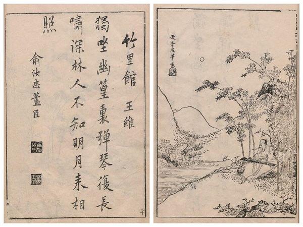 唐詩可以誦,也可以看。圖為明代《唐詩畫譜》中描繪王維《竹里館》詩意的一頁。 (資料圖片)