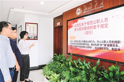 江西省贛州市章貢區紀委監委開展公職人員違規借貸問題專項治理,并出臺《章貢區關于規范公職人員參與民間借貸的若干規定(試行)》,明令禁止公職人員利用職權違規參與民間借貸謀利,厘清公職人員與管理和服務對象交往界限。圖為該區紀委監委干部在學習討論規定。廖寶豐 攝