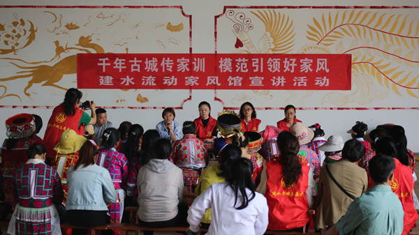 建水縣紀(jì)委監(jiān)委聯(lián)合縣婦聯(lián)等部門開展“流動(dòng)家風(fēng)館巡回宣講”活動(dòng),讓廉潔之花在建水處處綻放。圖為該縣家風(fēng)宣講團(tuán)成員到利民鄉(xiāng)開展宣講。(熊志寅 攝)