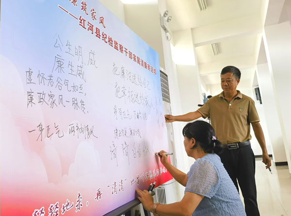 紅河縣紀(jì)委監(jiān)委把家風(fēng)建設(shè)作為紀(jì)檢監(jiān)察干部作風(fēng)建設(shè)的重要內(nèi)容,通過開展分享廉潔故事、簽訂承諾書、觀看警示教育片等系列家庭助廉活動(dòng),推動(dòng)良好家風(fēng)和干部作風(fēng)相互促進(jìn)、共同提升。圖為該縣紀(jì)檢監(jiān)察干部家屬在清廉寄語墻上題寫寄語。(楊紫童 攝)