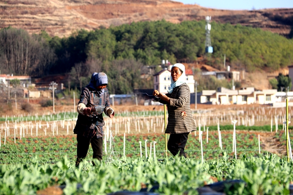 時令已至驚蟄,昭通市昭陽區布嘎鄉白石村水果豌豆開始萌芽生長,村民們忙著澆灌、搭架、施肥……(秦輝 攝)