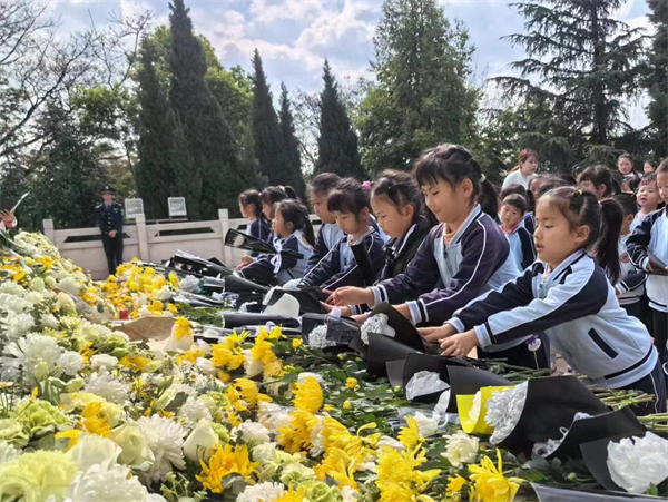 昆明市呈貢區(qū)第六幼兒園的孩子們向革命烈士紀念碑敬獻自己親手制作的花束,寄托對英烈的哀思。(李沅瑾 攝)