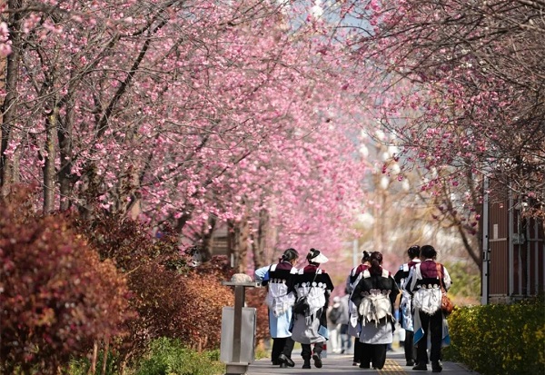 清明時節(jié),位于雪山路的麗江櫻花大道迎來高光時刻。一排排、一樹樹的櫻花開滿枝頭,一群納西群眾身著傳統(tǒng)服飾,來這里踏青游玩,感受春光的美好。(錢磊 攝)