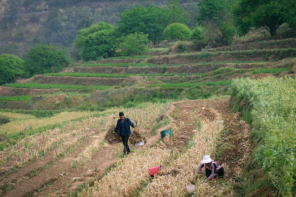清明時節(jié)農事忙。在陸良縣大莫古鎮(zhèn)發(fā)峨哨村委會小疊水村,農民正在采收大蒜。(王勇 攝)