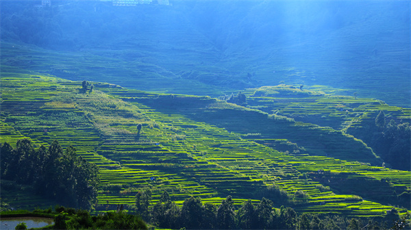 太陽光束垂直打在綠浪滾滾的梯田上,元陽哈尼梯田煥發出夏日生機,仿佛在吟唱生命之歌。(陶晴 攝)