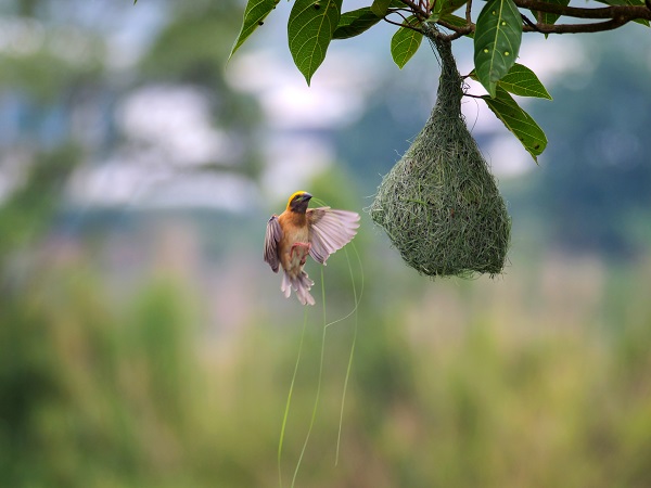 近期,被譽為動物界“最美紡織工”的黃胸織布鳥現身昌寧縣灣甸傣族鄉勐波羅河畔,正在對巢穴進行最后的“精裝修”。(普文鴻 攝)