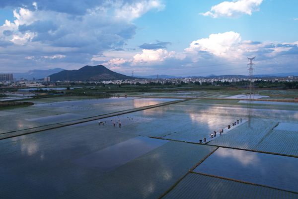 夏至時節,昭通市昭魯壩區迎來了高原水稻插秧季,人們正在搶抓時間插播高原水稻。(周啟忠 攝)