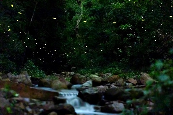 夏日的夜晚,鎮沅縣恩樂鎮勤勞村補麻河邊,螢火蟲像是提著幽幽燈籠的小精靈,伴隨著溪流,如童話世界般瑰麗神奇。(王文洪 攝)