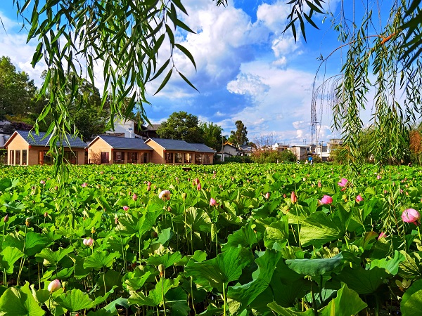 姚安縣光碌古鎮綠柳成蔭,荷塘里成片的荷花次第盛開,顯露出夏日的生機。(徐燕梅 攝)