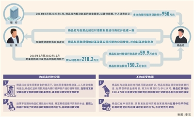 高利轉(zhuǎn)貸罪。2014年9月至2023年1月,楊品紅為解決趙某的資金需求,以裝修房屋、個人消費名義向銀行循環(huán)貸款共計950萬元。在取得貸款的當(dāng)日或次日,楊品紅便將款項借給趙某及其實際控制的公司使用,并向趙某收取利息(二人此前就利息多少達成一致)。2015年6月至2022年12月,趙某向楊品紅及楊品紅指定的賬戶轉(zhuǎn)入利息共計210.2萬元。除支付給銀行利息共計59.9萬余元外,楊品紅非法獲利150.2萬余元。
