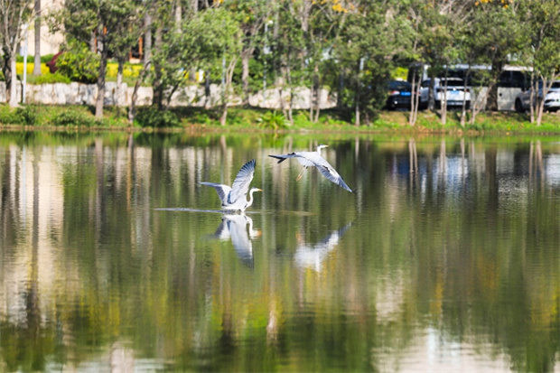 春分之際,紅河州彌勒市湖泉生態(tài)園湖上風(fēng)光正好。兩只蒼鷺結(jié)伴而來,時(shí)而并肩浮游,湖水輕漾;時(shí)而比翼騰空,身姿矯健。它們?cè)诤嫔媳M情舞動(dòng),于暖春中勾勒出一幅美妙且靈動(dòng)的自然圖景。(張建聰 攝)