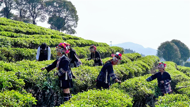 春分時(shí)節(jié),勐海縣布朗山鄉(xiāng)青山翠嶺間,身著民族盛裝的采茶人穿梭于茶樹叢中,采擷著春日的鮮嫩與希望。(陳藝玲 攝)
