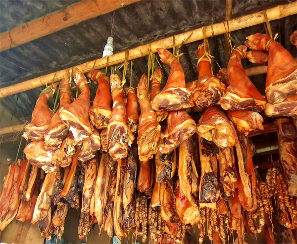 家家戶戶腌制“咸貨”,將反復揉搓腌制的一塊塊肥美的肉放在陰涼背光的地方,慢慢晾曬融入時光的味道,靜靜等待新年的到來。(聶涵 攝)