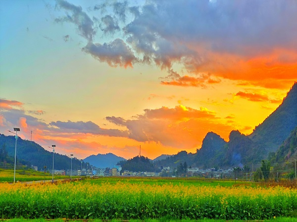 冬日傍晚,昌寧更戛的鄉間田野,天空被晚霞染成了橘黃色,余暉灑落田野。在夕陽照射下,暖色晚霞、金燦燦的油菜花、碧青的山巒構成了一幅詩情畫意的和美鄉村畫卷。(楊沖楷 攝)