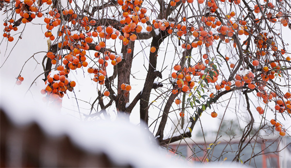 在白霧寒氣映襯下,掛滿枝丫的柿子像紅紅的燈籠,為冬日帶來了勃勃生機。(張玉玲 攝)