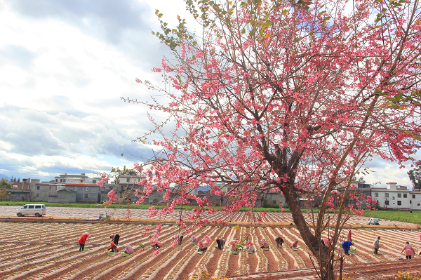 姚安一馬平川的田地里,隨處可見田間一派繁忙景象,與路邊綻放的冬櫻花形成了一幅生機盎然的希望畫卷。(布春近 攝)