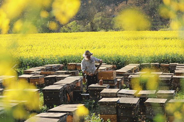 曲靖市百萬畝油菜花次第綻放,金燦燦的花海吸引了各地養(yǎng)蜂人來此“安營扎寨”,養(yǎng)蜂人趁著晴天放蜂采蜜,醞釀甜蜜生活。(方俊 攝)