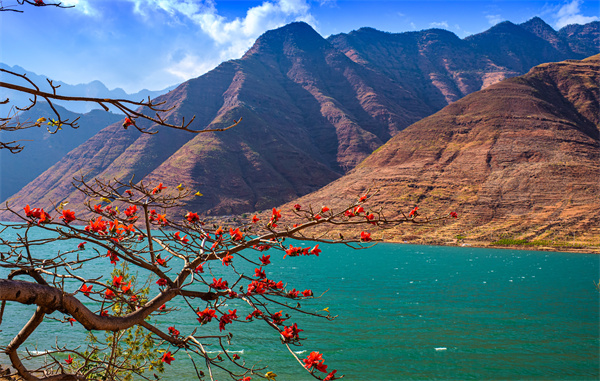 雨水時節(jié),大地回春。大姚縣灣碧鄉(xiāng)金沙江畔的木棉花似燃燒的云霞熱烈綻放,花朵灼灼,與碧綠江水、巍峨山巒相映成趣。(李長元 攝)